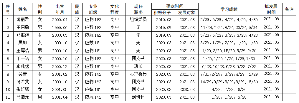 根据本人申请、党组织培养、经公司党委员工党支部研究,拟吸收朱妍臻等11名同志为中共预备党员,现将其有关情况予以公示,公示时间:2021.06.04-2021.06.10,如有异议,请实名致电0532-88958935。