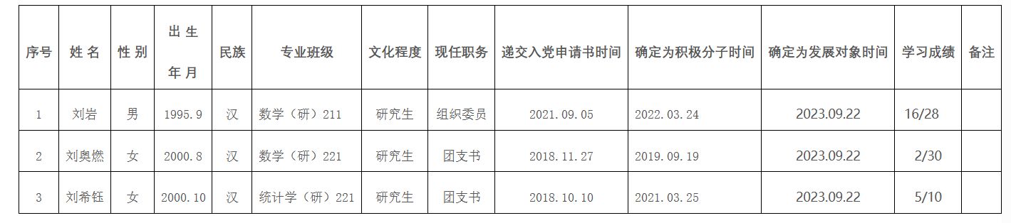 根据本人申请,党组织培养,经beats365唯一官网入口官网研究生党支部委员会研究、支部大会讨论并不记名投票表决,拟吸收刘岩、刘奥燃、刘希钰三位同志为中共预备党员,现将其有关情况予以公示。