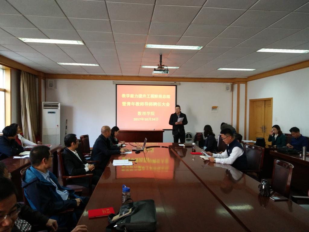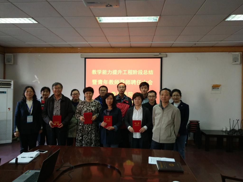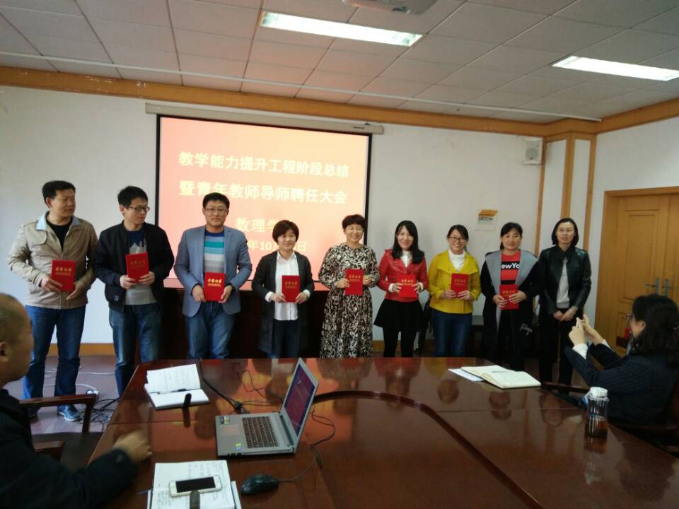 随后,郭广海宣读了青年教师导师制实施办法,对导师和青年教师的要求做了进一步的细化,教务处处长王霞为导师颁发聘书,物理系娄斐老师作为青年教师代表发言。会议还表彰了在教学能力提升工程中获奖的个人,李淑贞、杨树国分别为课件比赛和教学比赛获奖者颁奖。