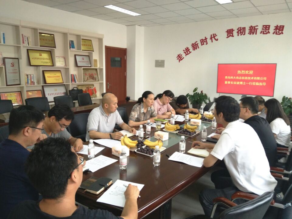 为增强校企交流与合作,7月23日下午,青岛科大有志信息技术有限公司董事长宋波、技术总监田波等一行4人来公司进行洽谈交流,公司党总支书记李淑贞、经理杨树国、副书记兼副经理王丽、副经理郭广海以及数学系张瑞坤、邢建民、朱善良、刘祥鹏等参与了座谈,会议由党总支书记李淑贞主持。