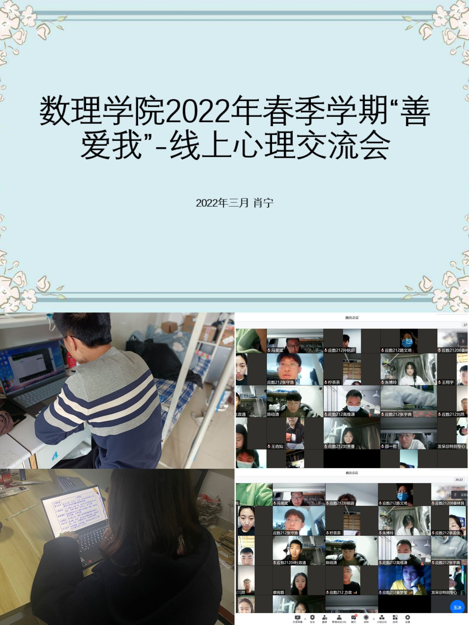 3月25日,公司举办了“善爱我-线上心理交流会”活动,会议采用腾讯会议的线上会议模式。首先,肖宁向同学们讲解了心理健康的相关知识,建议同学们疫情防控下通过制定一个计划、钻研一件事请、找到一种支持、进行一项锻炼、思考一些体验等方式,缓解心理压力;自己无法调整时,应当寻求在线心理咨询。良好的心理状态有助于提高自身免疫力。