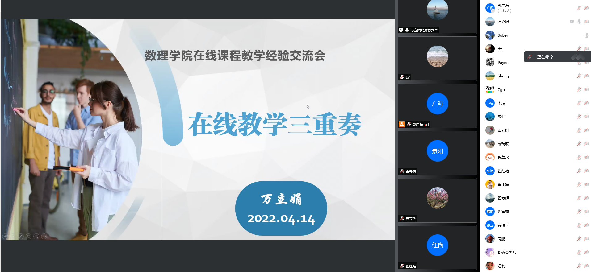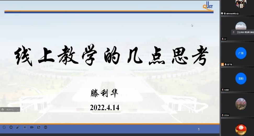 郭广海首先对公司近一个月的线上教学、线上听课及相关情况进行了介绍和反馈。他肯定了老师们克服困难、战胜疫情的担当,对老师们保障教学秩序和教学效果提出表扬,他表示在老师们的共同努力下全院公共课和专业课均保持良好的教学秩序。公司不同专业六位教师从多角度进行了线上教学经验分享交流。