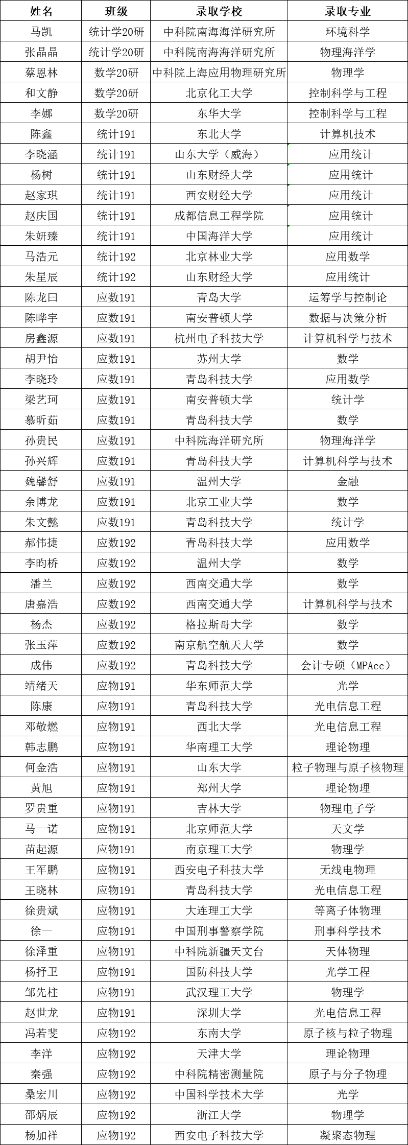 汗马耕耘有矢志,硕果飘香又一年,2023届毕业生升学深造再创佳绩。2023届毕业生共199人,5名硕士研究生考取博士研究生,50名本科生考取硕士研究生。本科生中,8人保研,42人考取硕士研究生,升学率达29.76%,其中30人被国防科技大学、中国科学技术大学、东南大学等“985”“211”高校录取,占总录取人数的60%;4人考入中科院海洋研究所、中科院新疆天文台、中科院精密测量院、中国刑事警察公司;3人考入格拉斯哥大学、英国南安普顿大学等国外知名院校;应物191班录取率达56.67%,其中“985”“211”院校占82.35%;应物192班邵炳辰同学、应数192班张玉萍同学和应物191班李洋同学分别以411分、394分、392分的成绩被浙江大学、南京航空航天大学、天津大学录取。