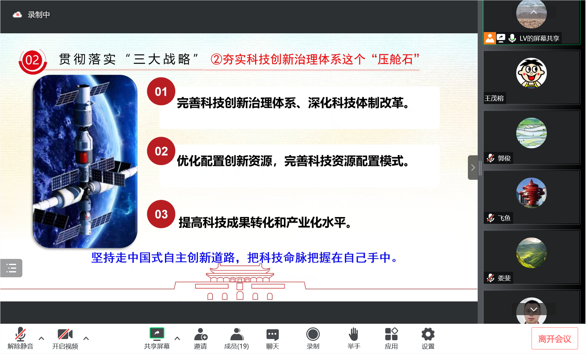 吕浩从“战略解读”和“贯彻落实”两大方面向党员同志宣讲分享。他指出“科教兴国、人才强国、创新驱动发展”三大战略是历史传承、时代要求和未来关键,要深刻理解、用心体会。贯彻落实三大战略任务,要牢牢握稳优先发展教育事业的“方向盘”、深深夯实科技创新治理体系这个“压舱石”、细细答好培育拔尖创新型人才这个“大考卷”。作为教师,要牢记教育初心,不忘为党育人、为国育才使命。始终心怀“为谁培养人、培养什么人、怎样培养人”这一教育的根本问题,努力做教育改革的奋进者、教育扶贫的先行者、员工成长的引导者。