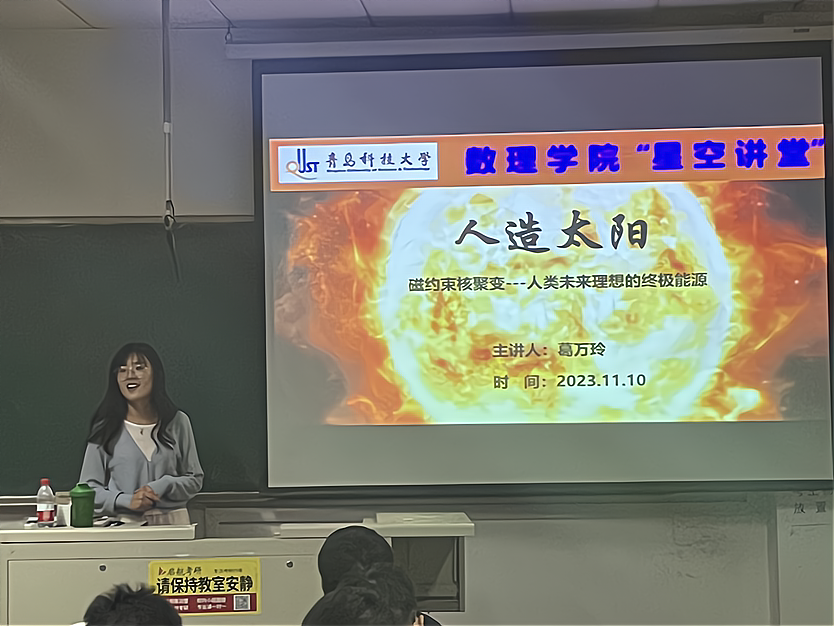 11月10日,2023级班主任葛万玲老师应邀做客beats365唯一官网入口官网”星空讲堂”,在明德楼323教室带来“磁约束核聚变--人类未来理想终极能源”专题学术讲座。本次讲座吸引了2023级、2022级物理专业本科生和相关专业研究生到场聆听。