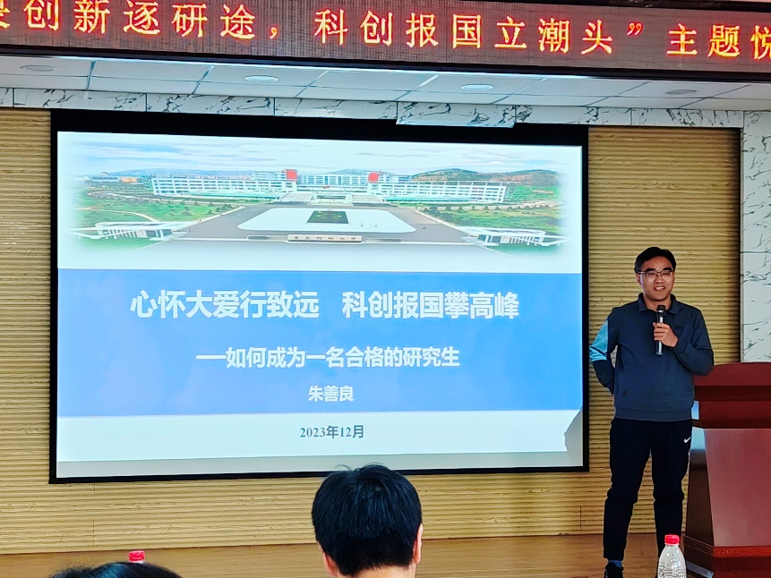 朱善良以“心怀大爱行致远,科创报国攀高峰”为主题,通过为什么读研、读研为什么、怎么做科研三个问题作为分享主题,层层递进,呼吁同学们以责任担当投身科研创新,在建设科技强国中谱写青春之歌 。
