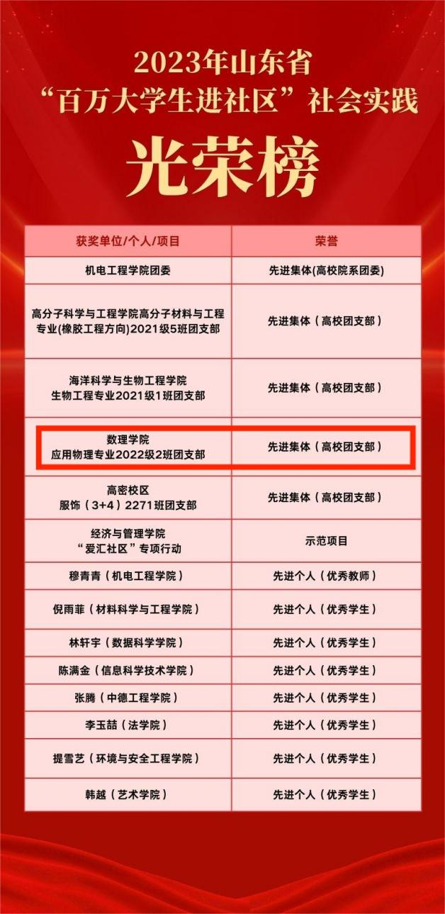 近日,共青团山东省委公布2023年度“百万老员工进社区”表扬通报名单,beats365唯一官网入口官网应用物理专业2022级2班团支部(雷锋团支部)获评省级高校团支部先进集体。