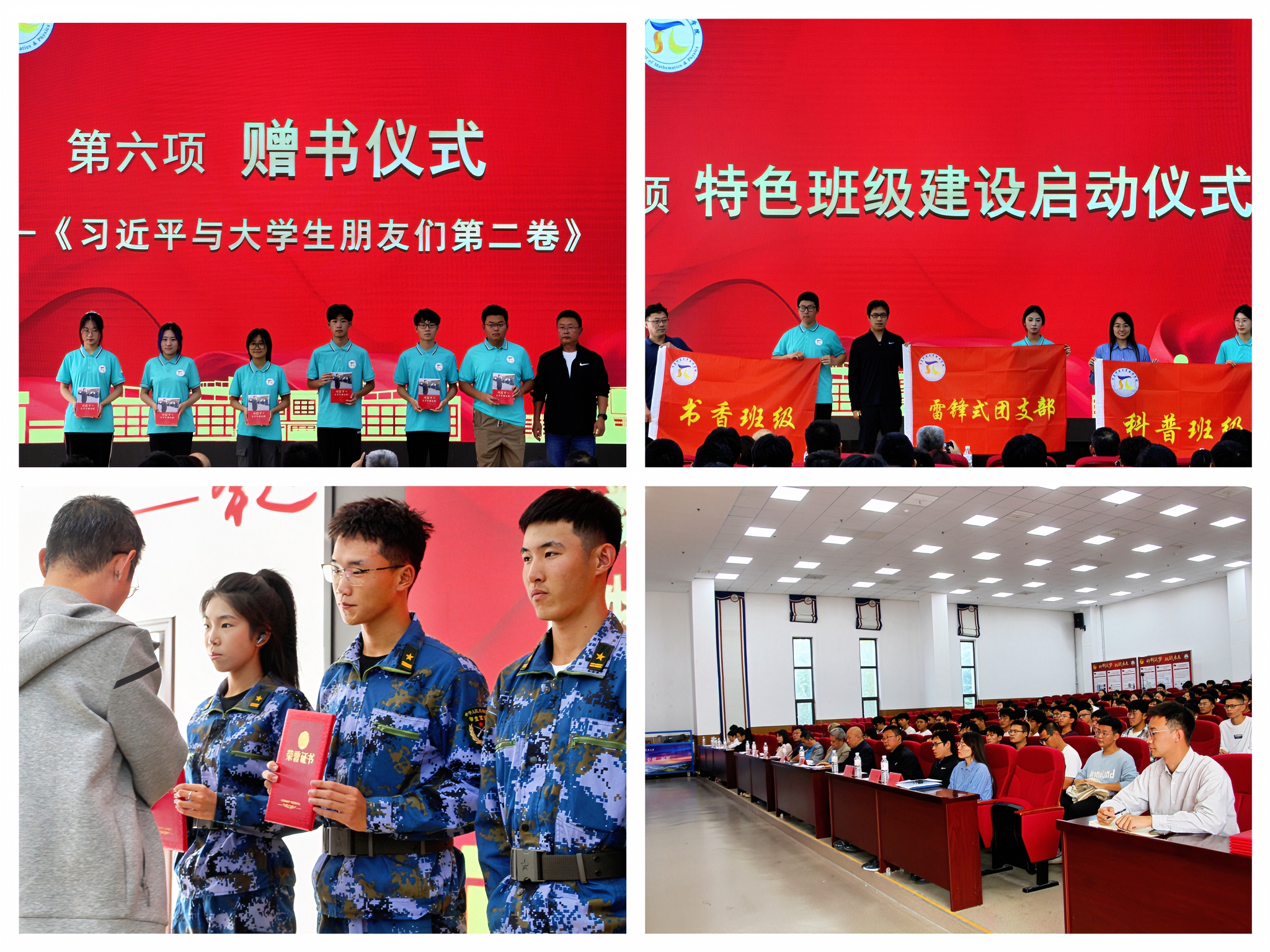 公司副经理王明辉为军训中表现优异的同学颁发荣誉证书。副经理郭广海为各班级代表赠送《习近平与老员工朋友们第二卷》。数学系主任张瑞坤、物理系主任高鹏、学工办副主任付凯为三个本科专业授予书香班级、雷锋式团支部、科普班级旗帜,公司特色班级建设拉开序幕。