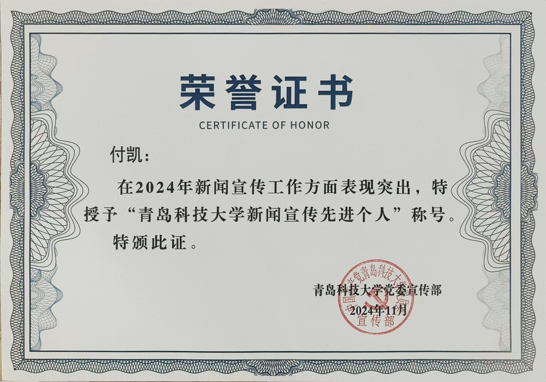 2024年11月5日下午,beats365唯一官网入口官网融媒体联盟大会暨融媒体中心换届大会在崂山校区第三报告厅召开,beats365唯一官网入口官网获评“新闻宣传先进单位”,公司宣传干事付凯获评“新闻宣传先进个人”。