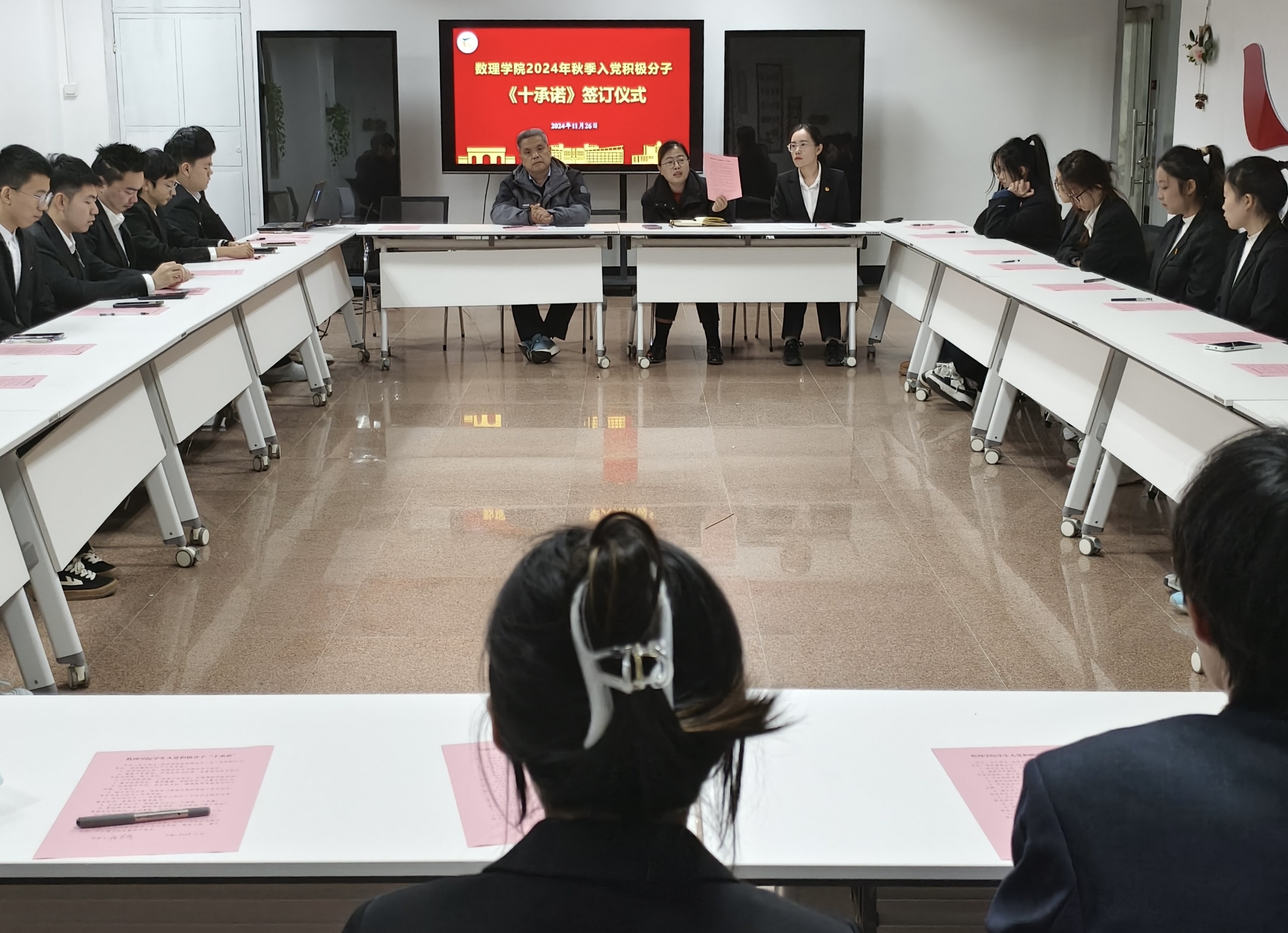 会上,应数221班李鸣凤等6名入党积极分子代表依次做口头思想汇报,向党组织现场汇报近期的思想、学习、实践、规划等各方面情况。应数221班陈琦宣读《十承诺》,30名入党积极分子现场签署承诺书。应数231崔傲涵作为代表进行现场表态。
