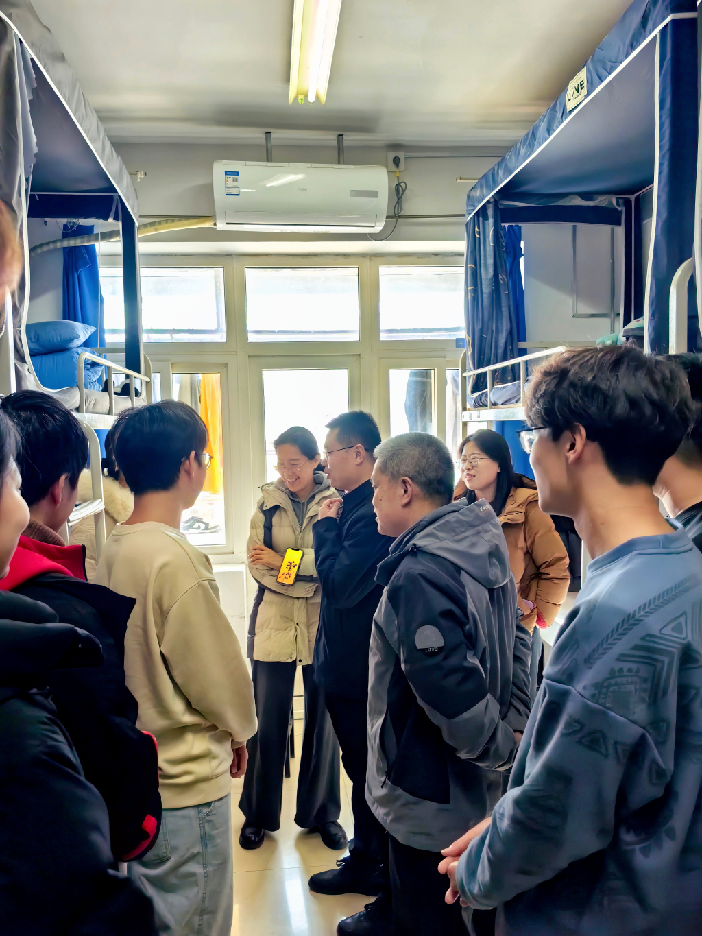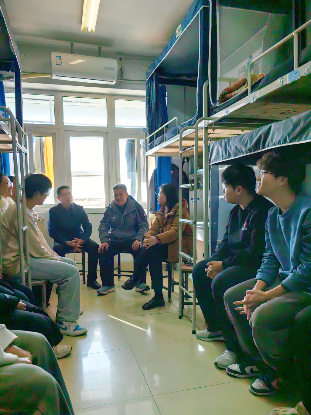 “期末考试还剩几门?考得如何?”“入党积极分子、宿舍网格员是否发挥作用?”现场老师们像关心家人般,亲切询问了同学们期末学习和生活情况,了解大家遇到的困难并耐心倾听同学们的意见和建议,鼓励同学们在期末之际要扎实复习、认真备考、诚信应考,用饱满的状态迎接每一场考试。走访中,老师们还重点强调了宿舍安全事宜。