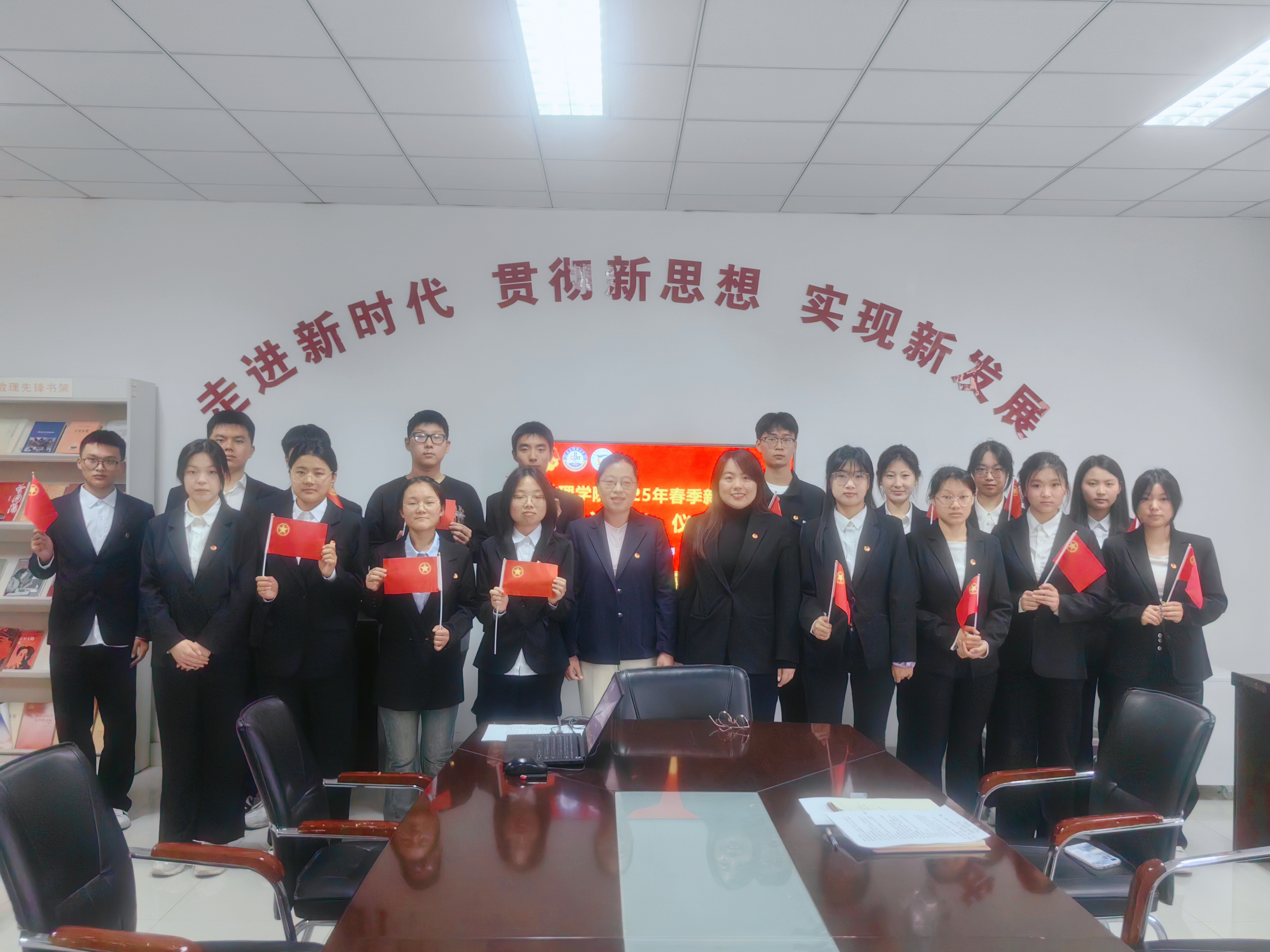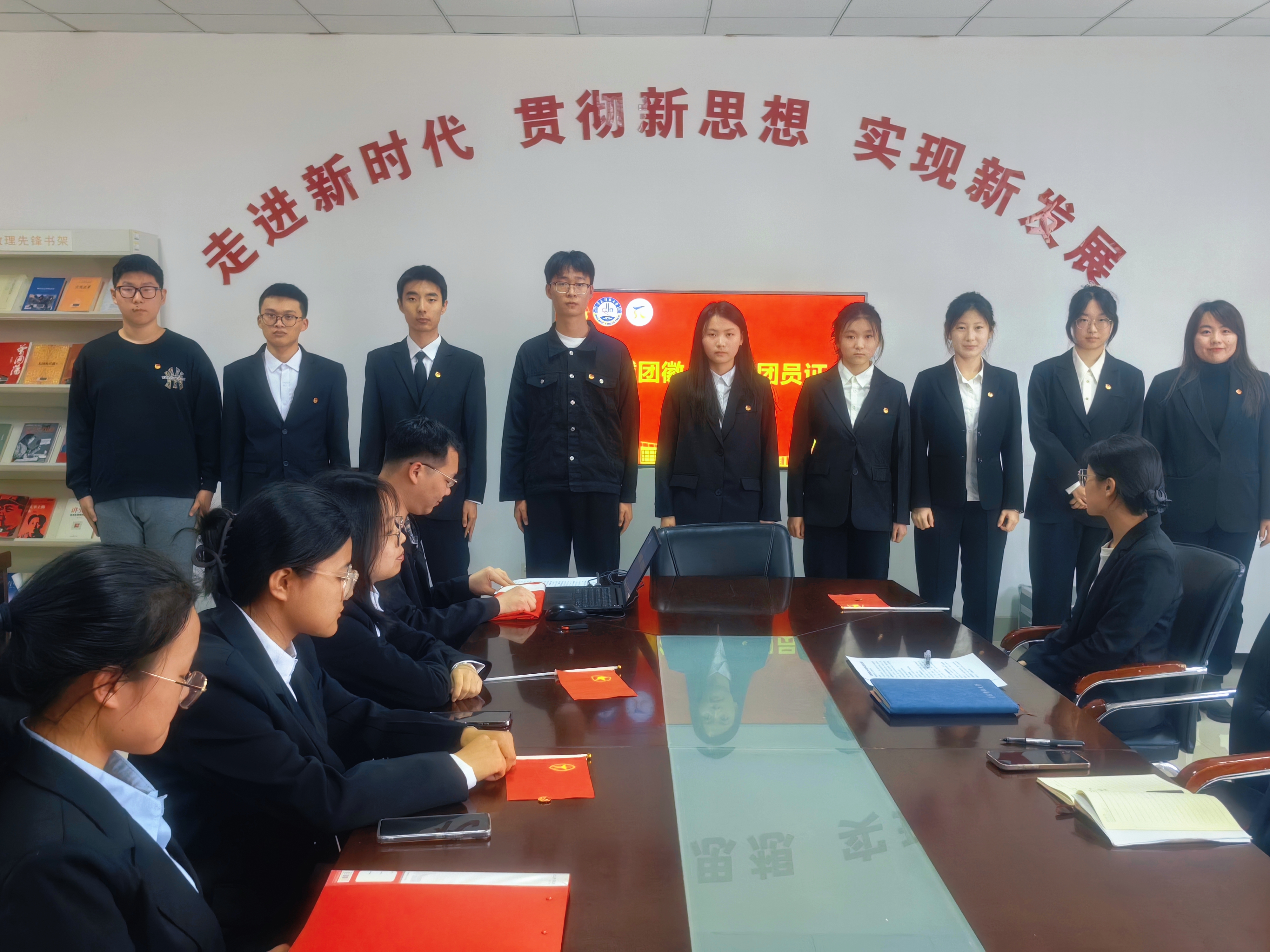 付凯为新团员佩戴团徽。优秀团员代表宁静带领新团员们面向团旗,郑重宣誓。新团员代表统计231刘灵梅、应数241李依依结合自身经历进行发言,新团员应树立理想,知行合一,在未来的日子里将努力在担当中成长,在奋斗中闪光,以实际行动践行自己的入团誓言。