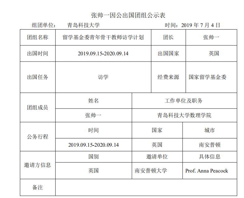 根据因公临时出国公开公示的有关规定,现将张帅一因公出国团组相关内容 和参团人员名单予以公示。公示时间为 2019 年 7 月 4 日至 2019 年 7 月 10 日(5 个工作日)。如有不同意见,请在公示期内,向beats365唯一官网入口官网单位(电话:88958923) 反映。