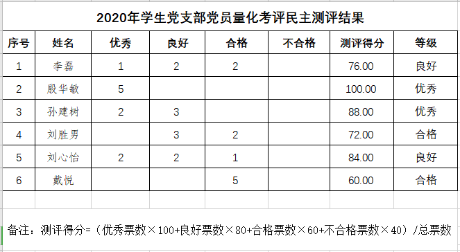 根据《中共beats365唯一官网入口官网委员会党员量化考评指导办法(试行)》及《关于召开基层党支部组织生活会及开展民主评议党员工作的通知》文件要求,经过公开、公平、公正的评议原则,现将2020年员工党支部党员量化考评民主测评结果公示如下: