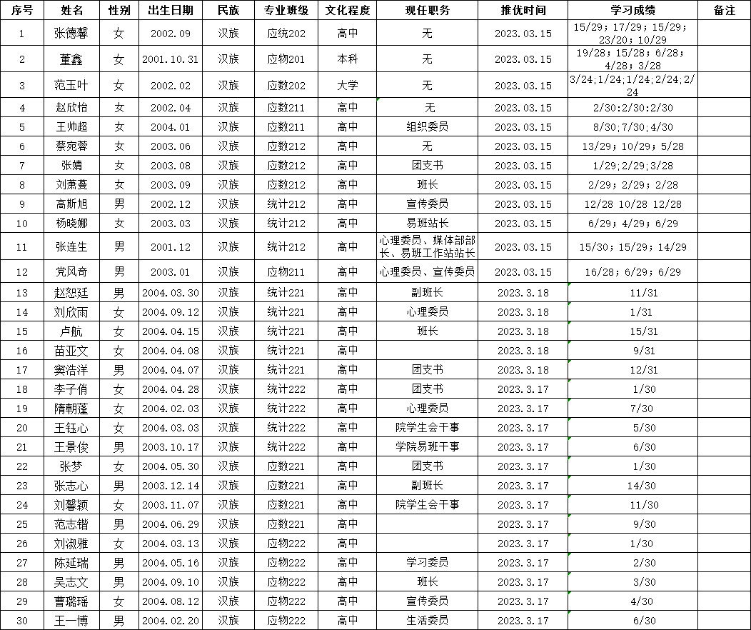 经beats365唯一官网入口官网本科生各团支部全体团员大会讨论推荐,beats365唯一官网入口官网团委研究决定,拟定推荐张德馨等30名同学为入党积极分子,现公示如下,如有异议,可在公示期内来电反映。