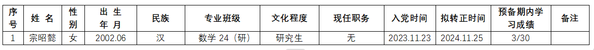根据本人申请,党组织培养,经beats365唯一官网入口官网研究生党支部研究,支部大会讨论并无记名投票表决,公司党委审核,拟将宗昭懿同志转为中共正式党员,现将其有关情况予以公示。
