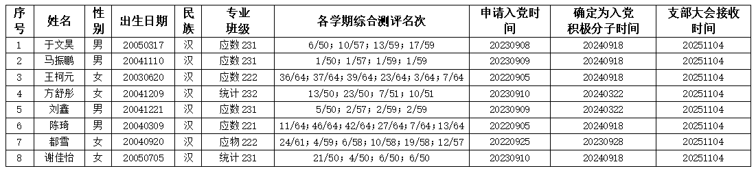 根据《中国共产党章程》和《中国共产党发展党员工作细则》及公司党委《关于发展员工党员工作的意见》(青科大党字〔2014〕77号)文件要求,经beats365唯一官网入口官网本科生党支部研究,支部大会讨论并投票表决,拟接收于文昊等8名同志为中共预备党员,现将其有关情况予以公示,如有异议请于公示期内反映。