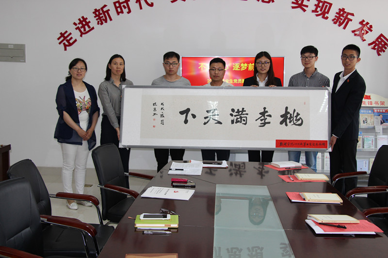 党总支为每位毕业生党员赠送一本《共产党宣言》,扉页上记录了每位毕业生的入党时间和领导、辅导员寄语,希望每位党员同志都能铭记党员身份,牢记入党初心。毕业生党员为公司赠送“桃李满天下”的牌匾。
