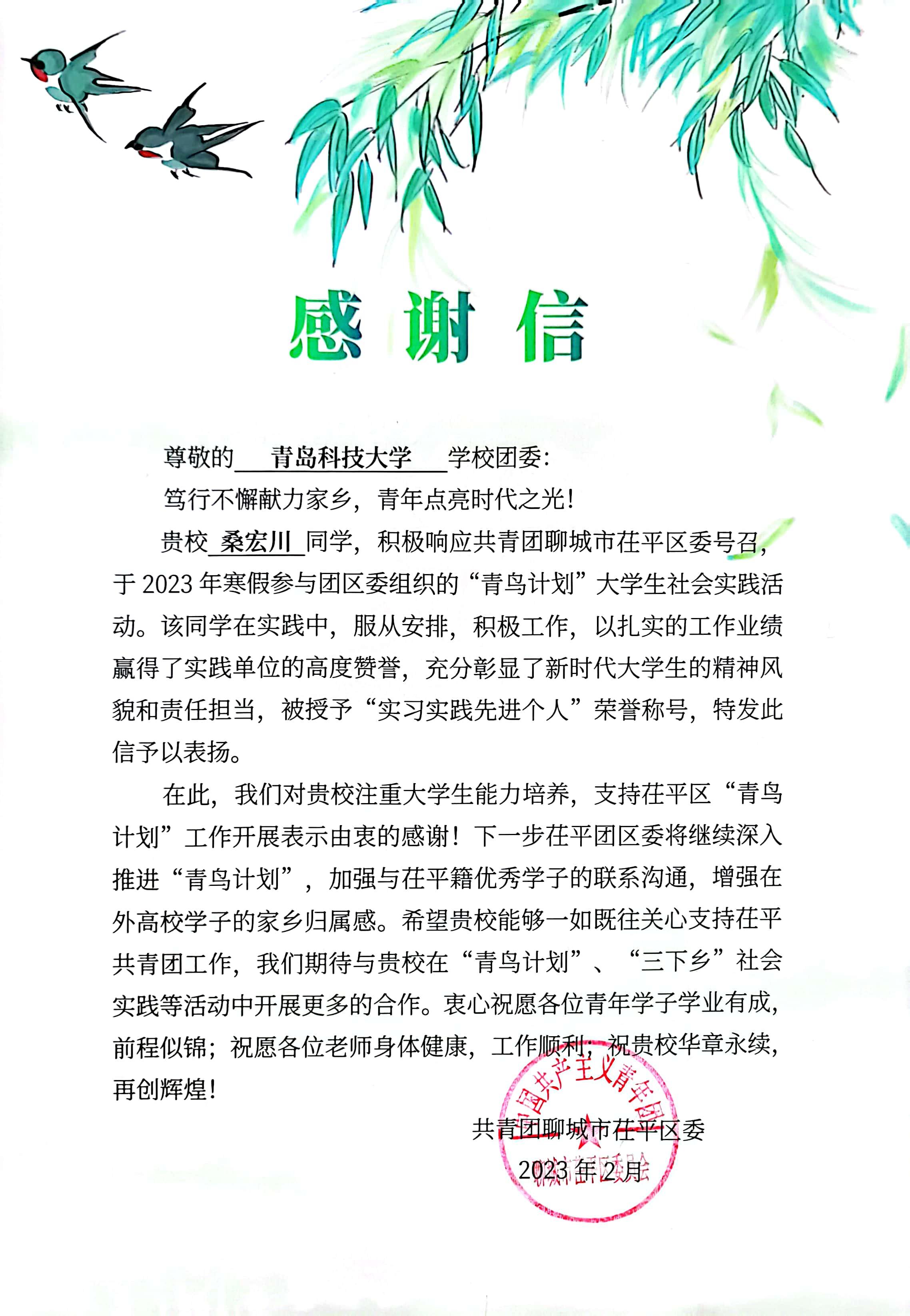 表扬信中提到,桑宏川同学积极响应共青团聊城市茌平区委号召,于2023年寒假参与团区委组织的“青鸟计划”老员工社会实践活动。该同学在实践中,服从安排,积极工作,以扎实的工作业绩赢得了实践单位的高度赞誉,充分彰显了新时代老员工的精神风貌和责任担当,被授予“实习实践先进个人”荣誉称号,特此发信予以表扬。