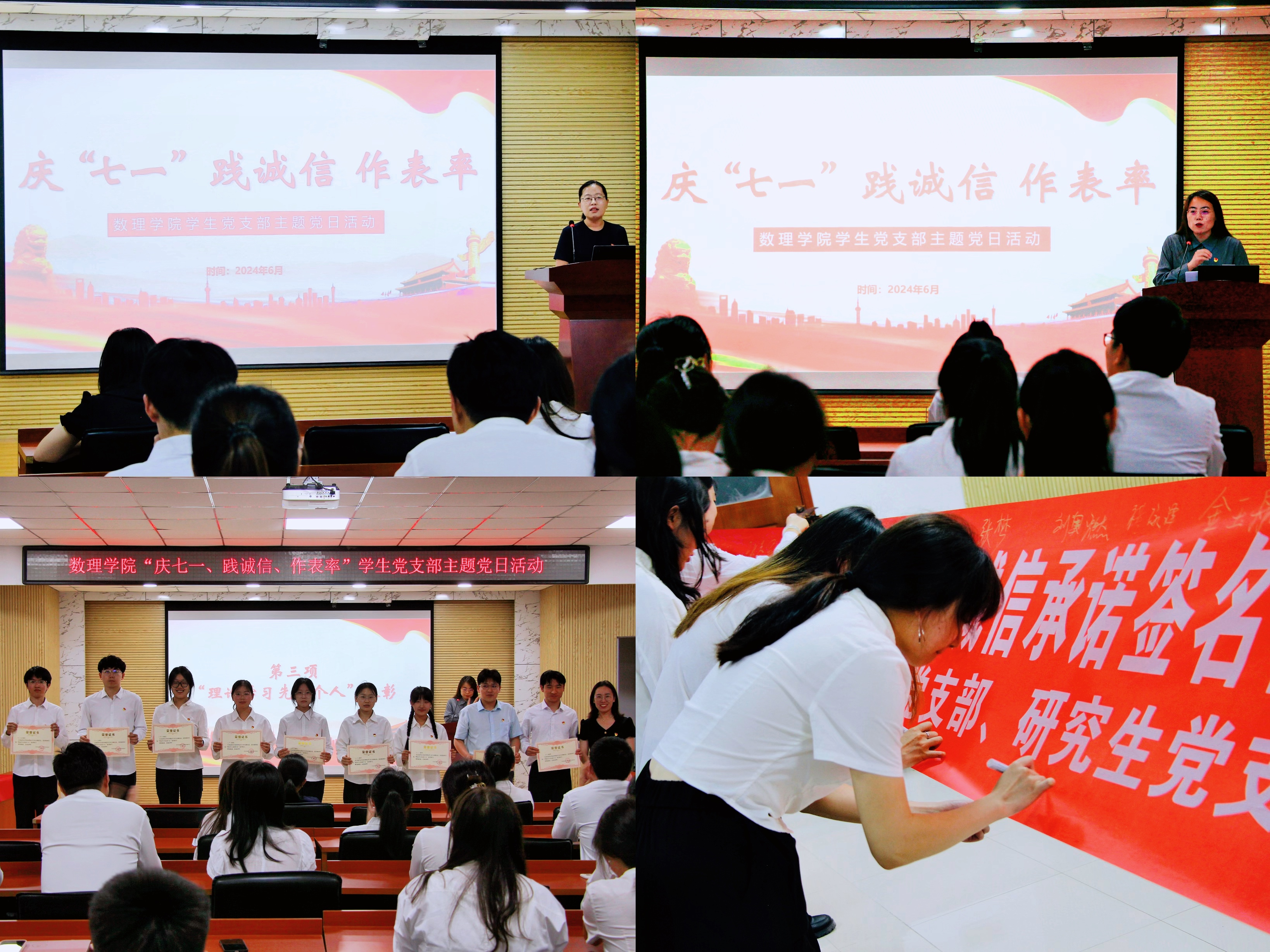 付凯带领与会成员学习了《beats365唯一官网入口官网考风考纪警示案例》,讲解了案例中考试作弊行为所带来的严重后果,提醒大家诚信考试,切莫因小失大。随后,刘敏为党纪学习阶段性测试成绩优异的同学颁发beats365唯一官网入口官网“理论学习先进个人”证书。最后,全体党员在承诺横幅上庄严签下了自己的名字,为诚实守信郑重许下诺言。