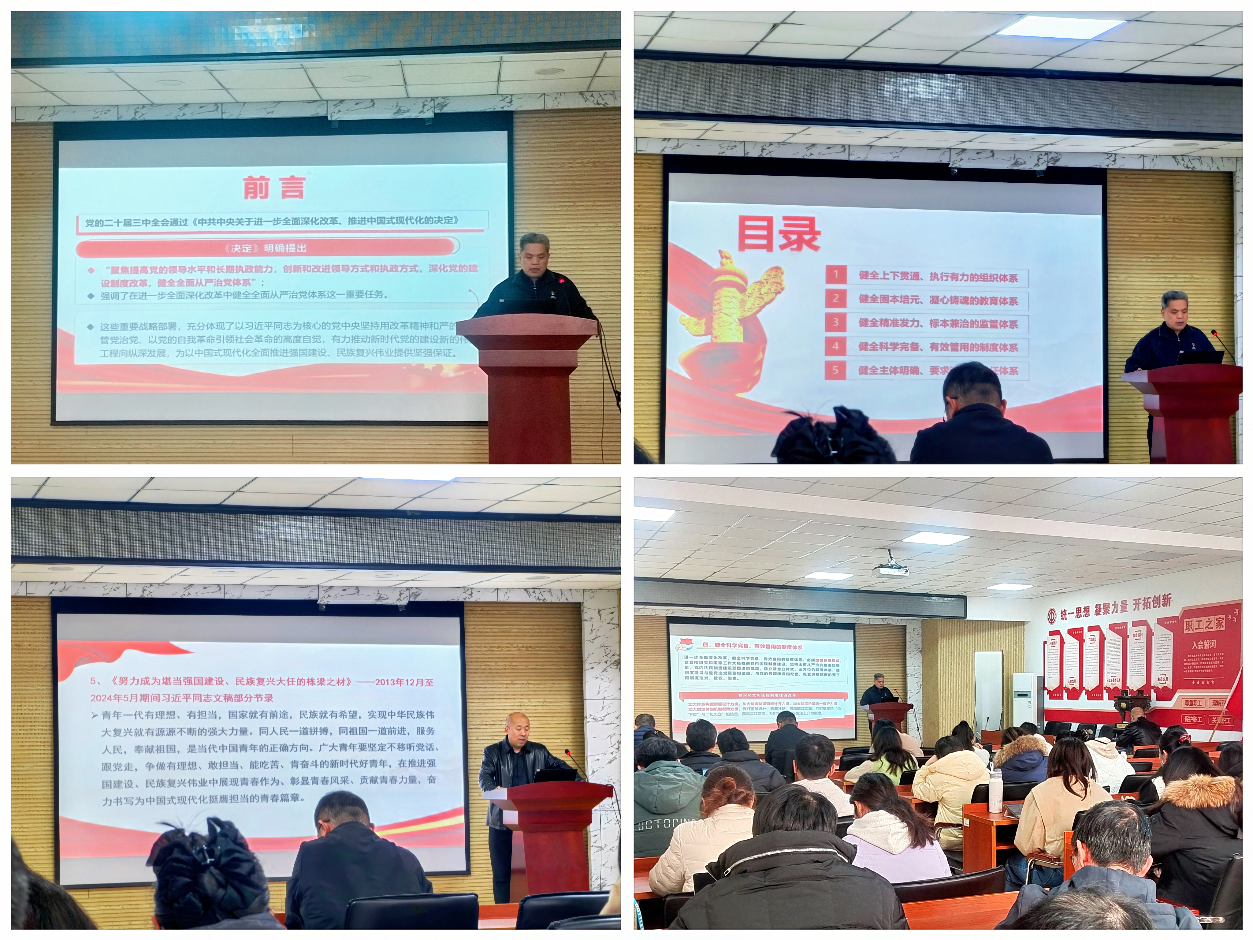 刘保成书记首先围绕“在进一步全面深化改革中健全全面从严治党体系”,详尽阐述了包括健全上下贯通、执行有力的组织体系,健全固本培元、凝心铸魂的教育体系,健全精准发力、标本兼治的监管体系,健全科学完备、有效管用的制度体系,健全主体明确、要求清晰的择日体系在内的五个方面。他强调,健全全面从严治党体系,是加强新时代党的建设的重大举措。在以中国式现代化全面推进强国建设、民族复兴的关键时期,要把健全全面从严治党体系这个重大举措落实好,要在实践中坚持内容上全涵盖、对象上全覆盖、责任上全链条、制度上全贯通,不断为以中国式现代化全面推进强国建设、民族复兴伟业提供坚强保证。