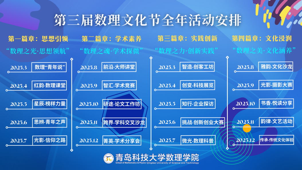 beats365唯一官网入口官网创新构建“思政融专业”育人体系,通过“数理+”思政载体建设实现价值引领与学科特色有机统一。依托数理文化节平台,精心培育出“星空讲堂”学术育人工程,打造“科普数理”实践育人品牌,深化“师生共读”文化育人项目,探索形成了立体化思政教育品牌矩阵。