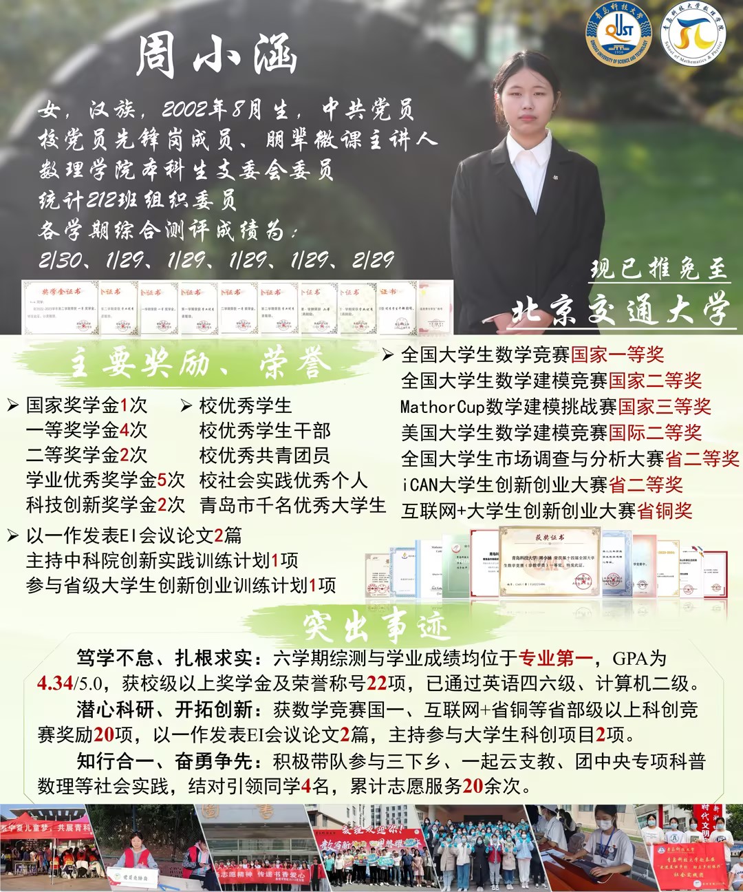 统计212班周小涵,为年级首批党员,任公司党员先锋岗成员、公司本科生支委会委员、班级组织委员,现已推免至北京交通大学。