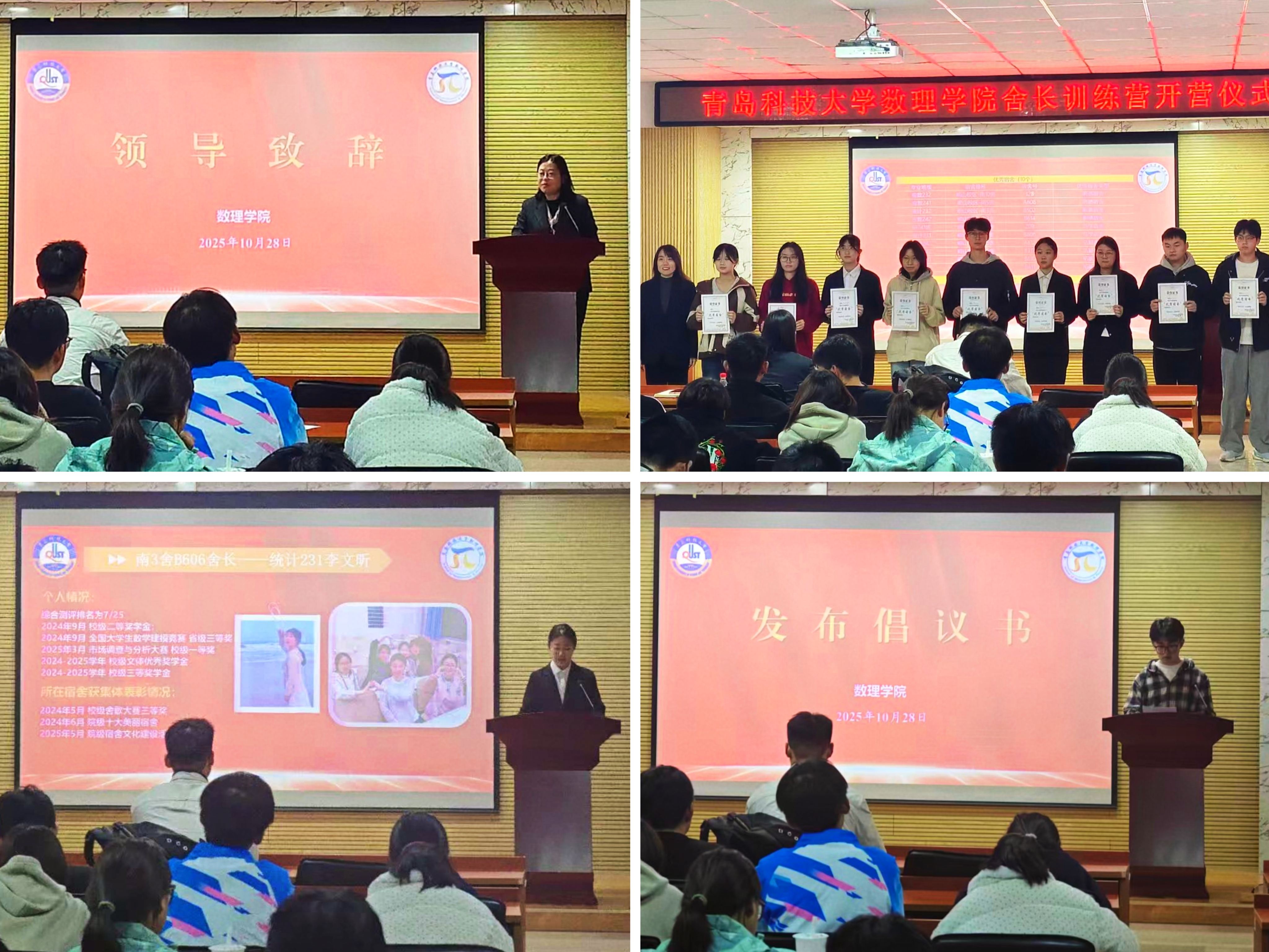 李雯雯为训练营启动仪式致辞,强调舍长作为“最小单元管理者”的关键作用,提出以服务者、协调者、守护者身份推动宿舍从“居住空间”向“成长乐园”转变,为舍长工作指明方向。仪式上,付凯为优秀宿舍代表颁奖,统计231班李文昕和应数242齐宁静两名优秀舍长结合个人经历分享工作经验,标杆宿舍舍长、应数241唐正强向全体舍长发起倡议,引导全体舍长积极响应号召、充分发挥履职热情。